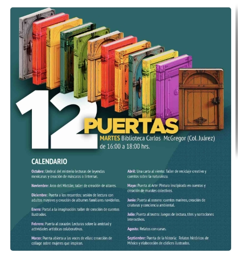 Sinopsis Arco del Mictlán; taller de creación de altares. Fecha y hora 25 noviembre, 2025 - 04:00 pm Clasificación Adolecentes y Adultos Tipo de evento Taller Lugar del evento Biblioteca Carlos McGregor - Col. Juárez Costo Evento gratuito